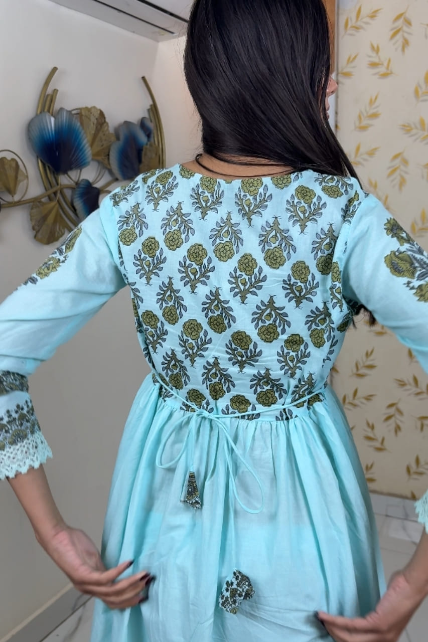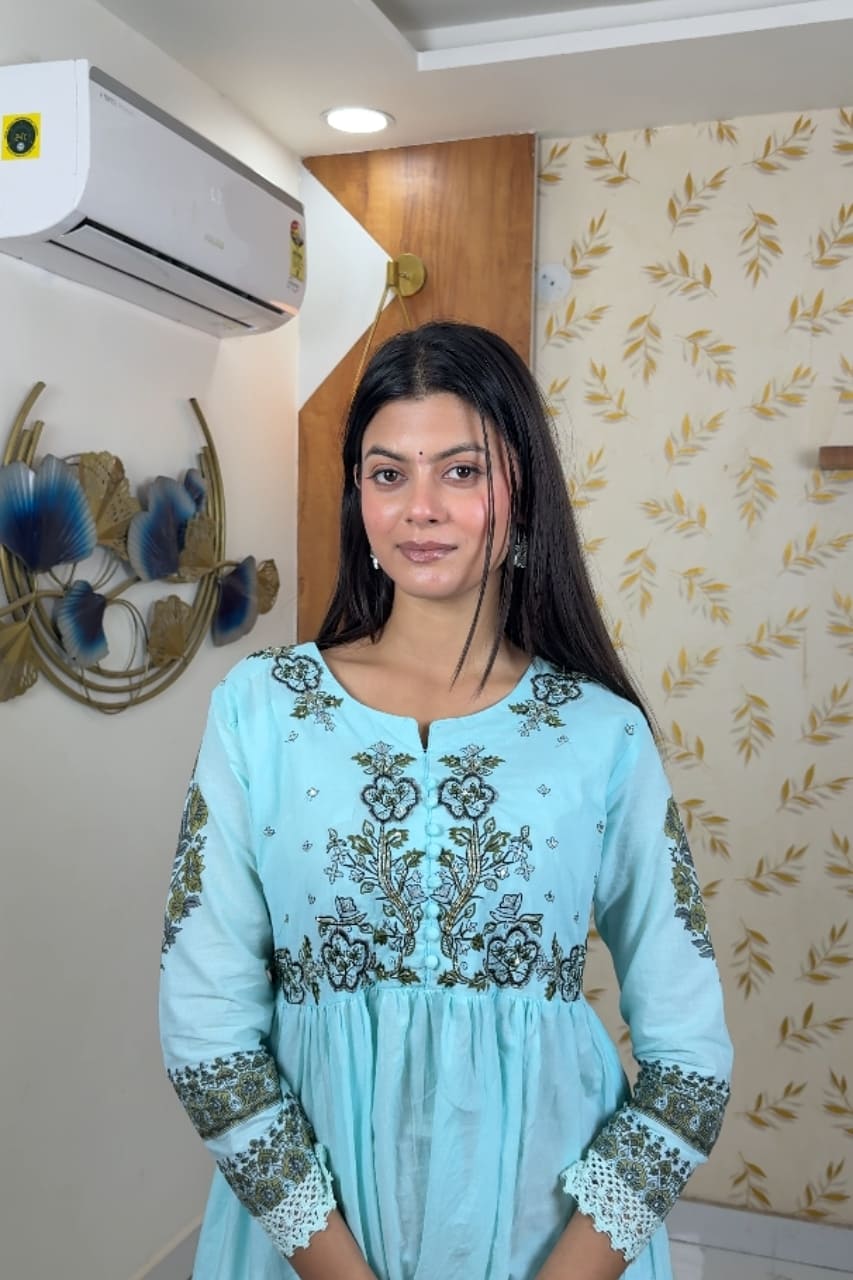 Sky Blue Floral Embroidered Cotton Kurti For Women