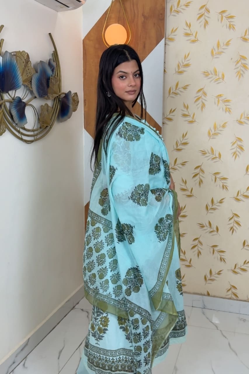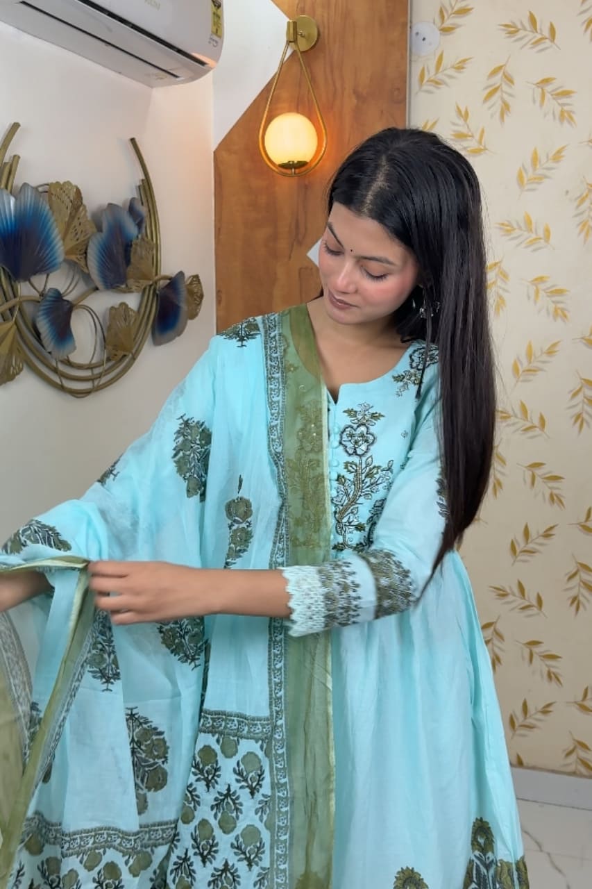 Elevate everyday elegance with this azure peacock embroidered cotton kurta set, crafted for the modern woman with a creative eye. The azure peacock embroidered cotton kurta set features a beautifully hand-embroidered peacock motif on the yoke, surrounded by miniature floral threadwork and artistic details. Every azure peacock embroidered cotton kurta set comes with a flowing printed dupatta and soft, straight-fit pants, making ensemble dressing effortlessly stylish.