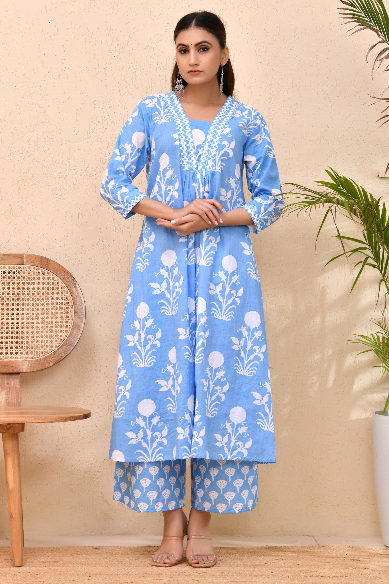 Sky Blue Cotton Printed Anarkali Kurta Set with Dupatta – Skyra